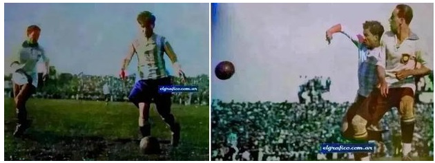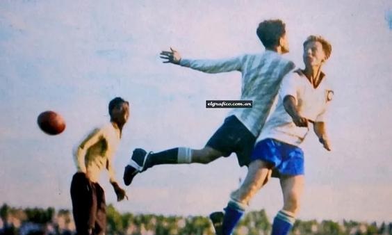 Cena do Argentinoa 2-0 Paraguai, em cabeceio de Irurieta sob marcação do paraguaio Díaz