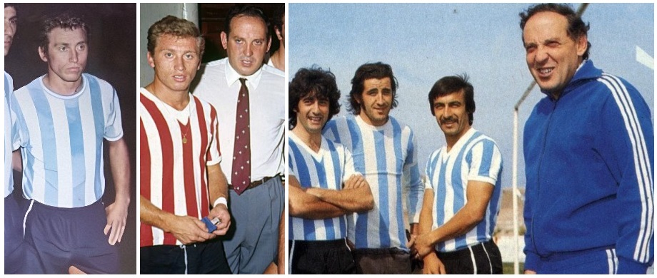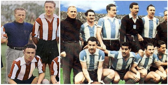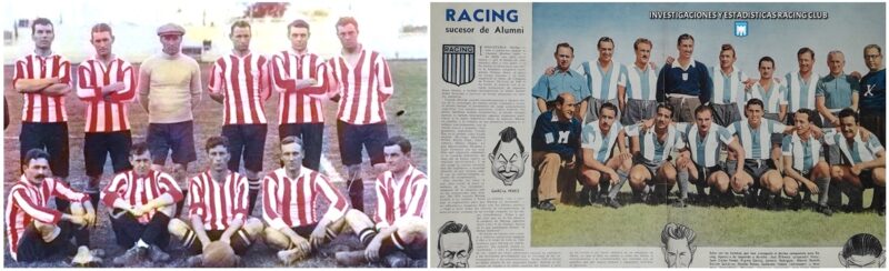 Stábile como técnico nos dois – é o primeiro em pé na foto da direita. Ongaro também está nas duas fotos, em pé junto a Stábile na alvirrubra e como último em pé na alviceleste. O pincharrata agachado é Gagliardo, reserva no Racing campeão em 1949