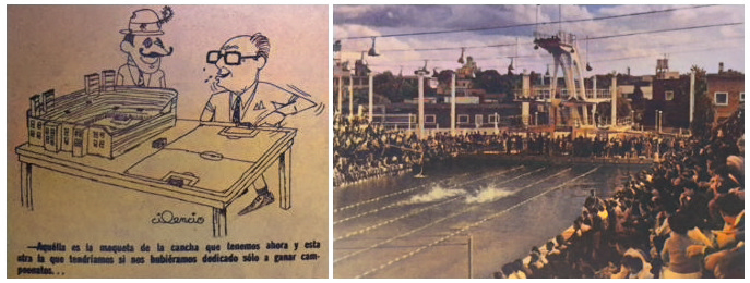 “Aquela é a maquete do estádio que temos agora e esta outra é a que teríamos se tivéssemos nos dedicado só a ganhar campeonatos” é a legenda da charge com o cartola velezano José Amalfitani. Na outra foto, o furor popular com o luxo que era uma piscina olímpica nos anos 50