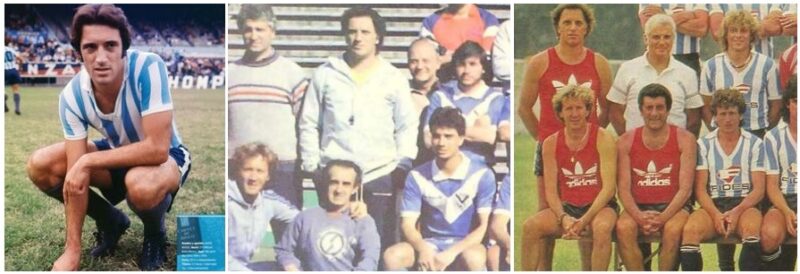 Basile como xerife no Racing e em duas imagens de 1985: técnico do Vélez no primeiro semestre e do Racing no segundo. Nelas, se vê Babington (homem mais à esquerda na fileira inferior em ambas)