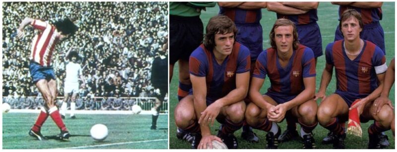 Rubén Cano marcando pelo Atlético o gol do título espanhol de 1977 em pleno dérbi de Madrid. À direita, Juan Carlos Heredia no Barcelona com os holandeses Neeskens e Cruijff
