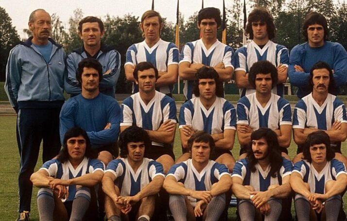 Junto a Kempes e ao goleiro Fillol na seleção de 1974: é o homem ao centro da fileira superior