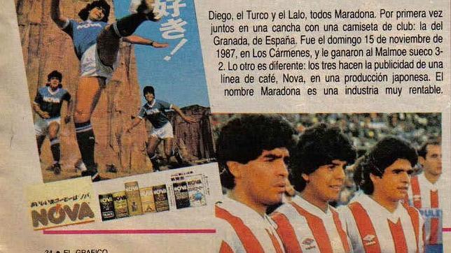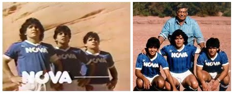 Uma marca japonesa de café também apostou que a grife Maradona se estenderia aos irmãos e usou os três nessa publicidade da esquerda