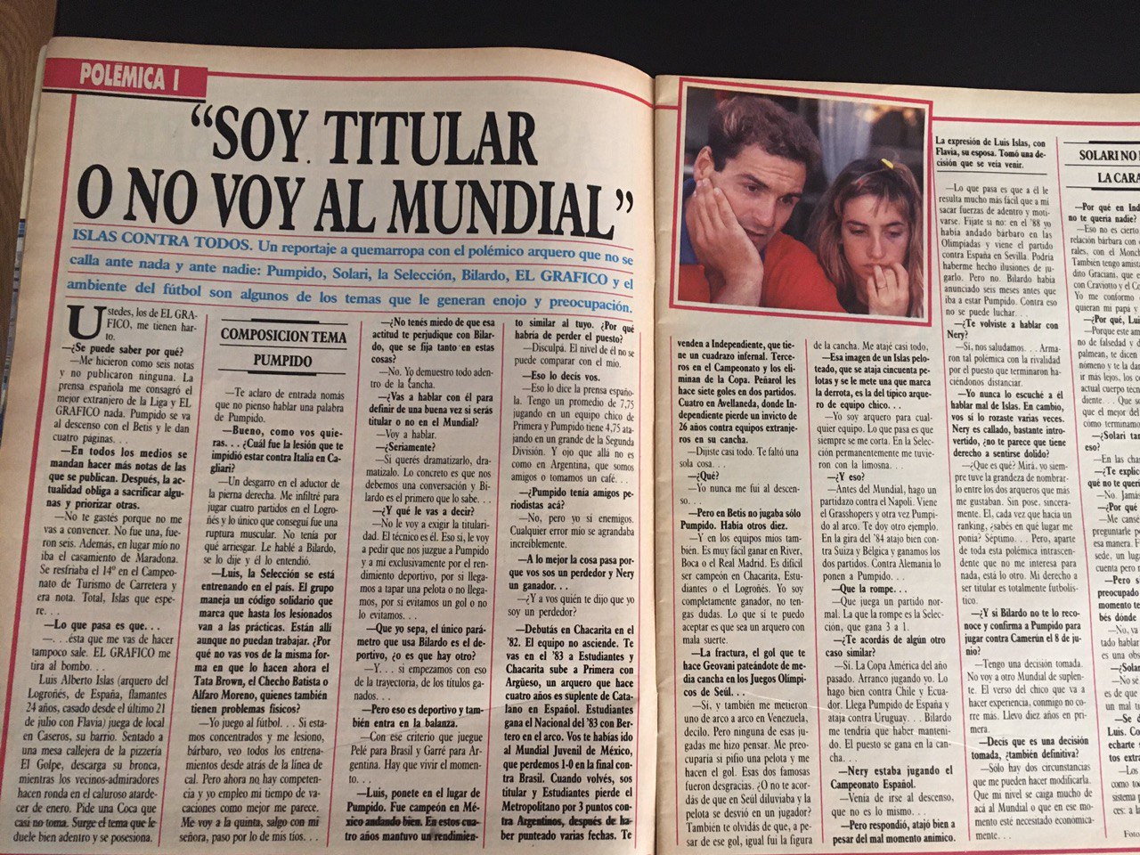 Pumpido precisou ser cortado após fraturar-se no segundo jogo e o país viu o virtual terceiro goleiro, Goycochea, aproveitar muito bem a vaga que caíra no colo que poderia ter sido o de um Islas mais paciente. “Agora é uma anedota. Quando Nery se lesionou, contatei ele, porque eu tive uma lesão parecida. Pensava em como estaria Pumpido e não especulava se me teria tocado jogar ou não. Não sou esse tipo de pessoa. Festejava os triunfos da Argentina e os pênaltis de Goyco eram importantes para isso. Ele é o melhor pegador de pênaltis que vi. Eu pego um a cada 80 anos e ele, nesse sentido, era um monstro. Quando eu não estou, não desejo que o outro vá mal. Isso é ser um medíocre. O melhor que pode fazer alguém é demonstrar que é melhor que o outro. Temos uma relação bárbara. Vive a duas quadras de casa. Sempre nos cruzamos e ficamos nos falando. O mesmo ocorre com Pumpido; se nos vemos, nos damos um abraço”.