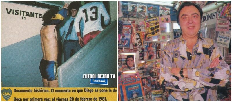 Bastidores: o empresário Jorge Cyterszpiler gerenciando a troca de Maradona do Argentinos Jrs para o Boca, na noite em que Diego atuou simbolicamente um tempo por cada. À direita, o narrador Marcelo Araujo – mais anos 90, impossível!