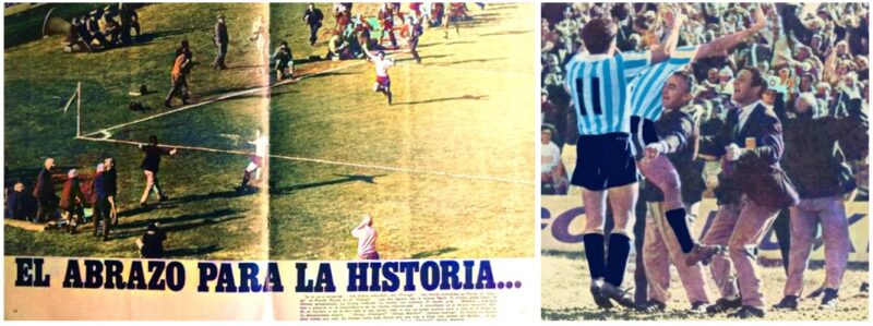 A Villa Devoto referida acima trata-se do bairro portenho em que se situa a mais famosa penitenciária de Buenos Aires. Mas o apito final também encerrou junto as fricções: os dois times trocaram camisas pacificamente – a El Gráfico até listou que Gemmell pediu a de Martín, Cárdenas trocou com Wallace e Perfumo com McNeill. Essa última troca também mereceu na época parágrafos na revista britânica World Soccer, a registrar declarações de um Perfumo que assumia alguma hesitação inicial seguida de comoção ao escutar o adversário lhe desejar buena suerte em perfeito espanhol. A primeira volta olímpica mundial da Argentina (ou meia-volta, pois alguns uruguaios furiosos atiravam objetos e inviabilizavam a conclusão da rota…) foi dada com as camisas alviverdes estranhamente misturadas aos calções e meias azuis.