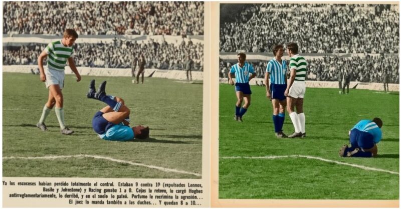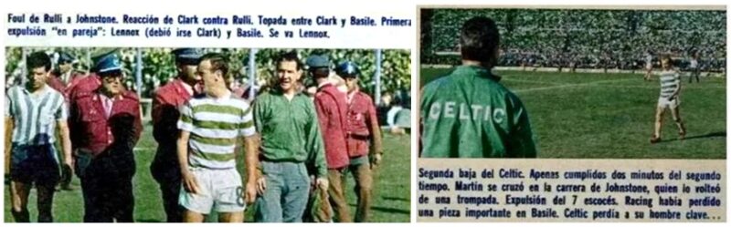 Bertie Auld também teria sua expulsão anunciada, mas simplesmente peitou a arbitragem e permaneceu em campo. “Mas ao Celtic já não sobravam forças nem resto de inspiração para impedir o que já estava flutuando no ambiente desde o momento em que Cárdenas cravou seu estupendo canhotaço alto desde quase 25 metros”, minimizou a El Gráfico. Aos 45 minutos, Bobby Murdoch entrou forte em Cárdenas. Com o novo tumulto gerado (na confusão, o onipresente Gemmell chegou a chutar o joelho de Raffo, que após a partida denunciara ter sido atingido também no estômago: “como não o expulsaram?”, ainda chiava), o árbitro encerrou a partida. Que teve as seguintes análises frias da El Gráfico: